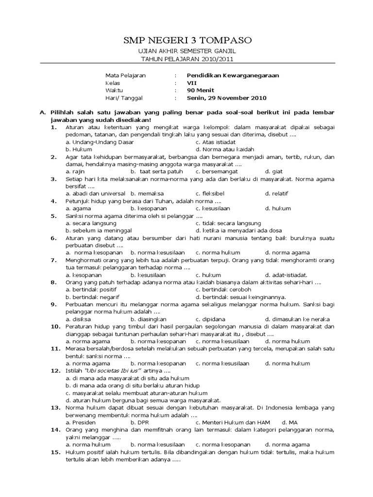 Soal pkn kelas 7 semester 1. Penilaian Tengah Semester merupakan salah satu bentuk penilaian hasil belajar peserta didik. Pada kesempatan ini ppkncoid akan memberikan Soal PKN Kelas 7 Semester 1 yuk. Soal PKN Kelas 7 Semester 1.