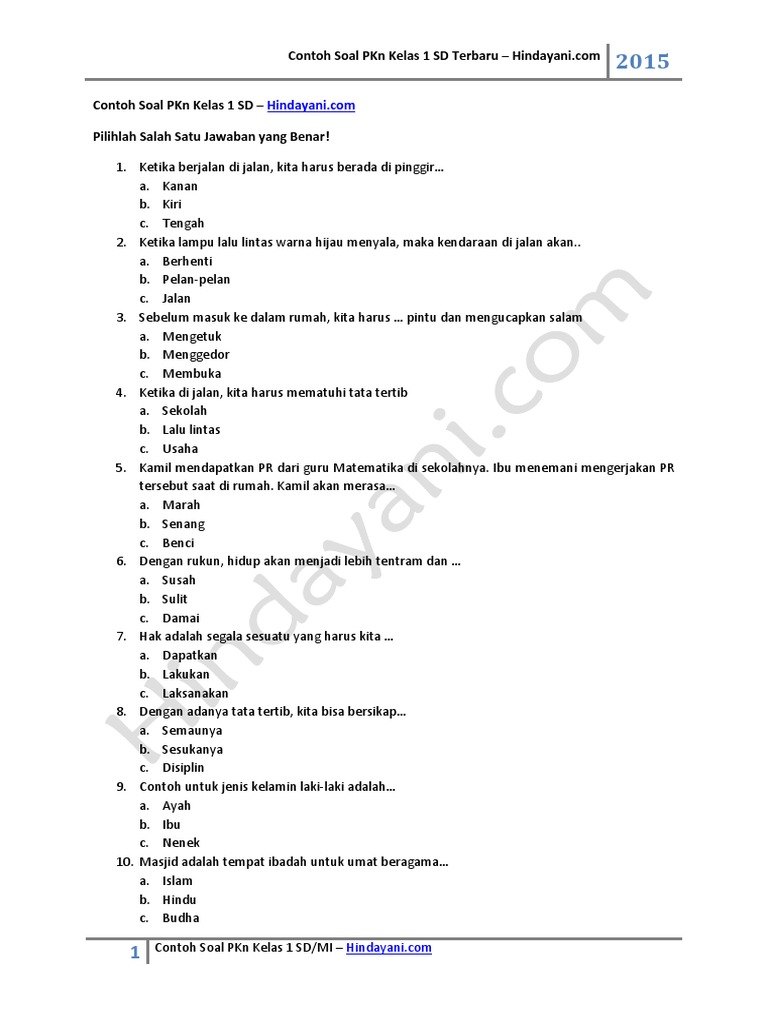 Artikel ini membahas tengang Soal PKn Kelas 1 untuk tahun ajaran 2020-2021 tingkat sekolah dasar SDMI pada mata pelajaran Pkn berdasarkan kurikulum terbaru. Kali ini Admin ingin membagikan Kumpulan Soal PKN Kelas 1 Satu SD Lengkap Semester 1 ganjil dan semester 2 Genap dan Kunci Jawabannya. 21 September 2017 Bimbingan Belajar Brilian.