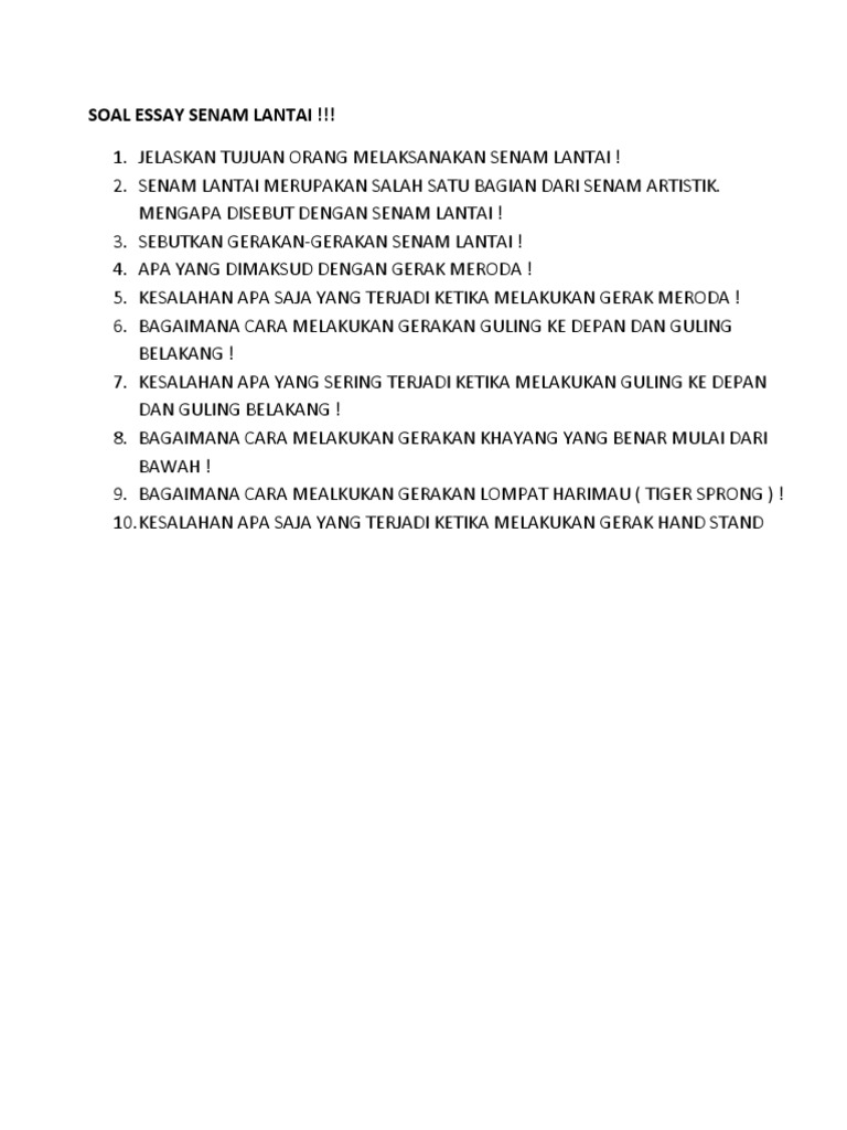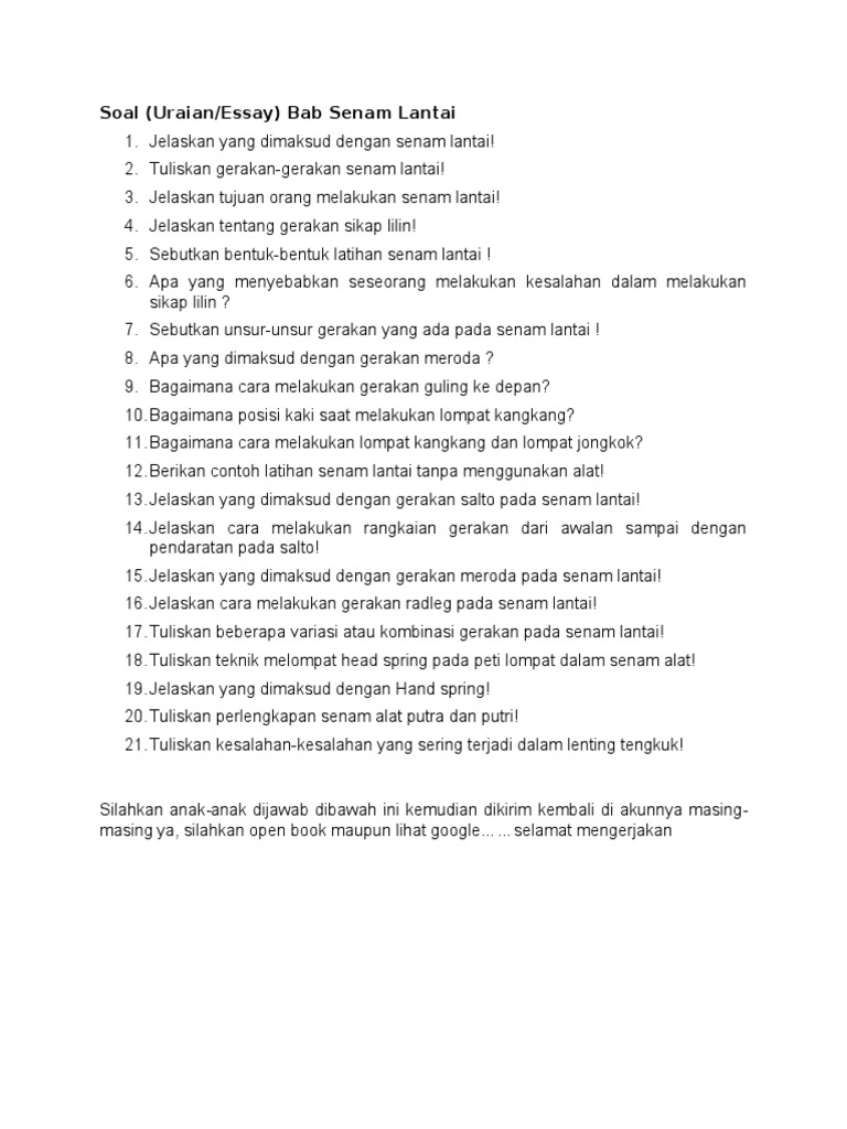 Our online essay service is the most reliable writing service on the web. If 10 Soal Essay Tentang Senam Lantai Beserta Jawabannya you are going to pay for essay make sure that you are paying quality writers as 10 Soal Essay Tentang Senam Lantai Beserta Jawabannya only quality writers can prove to you that hiring a writing service is a cost-worthy move and a decision that you will never regret. Adapun materi atau kompetensi dasar yang kami sampaikan yaitu tentang senam irama.