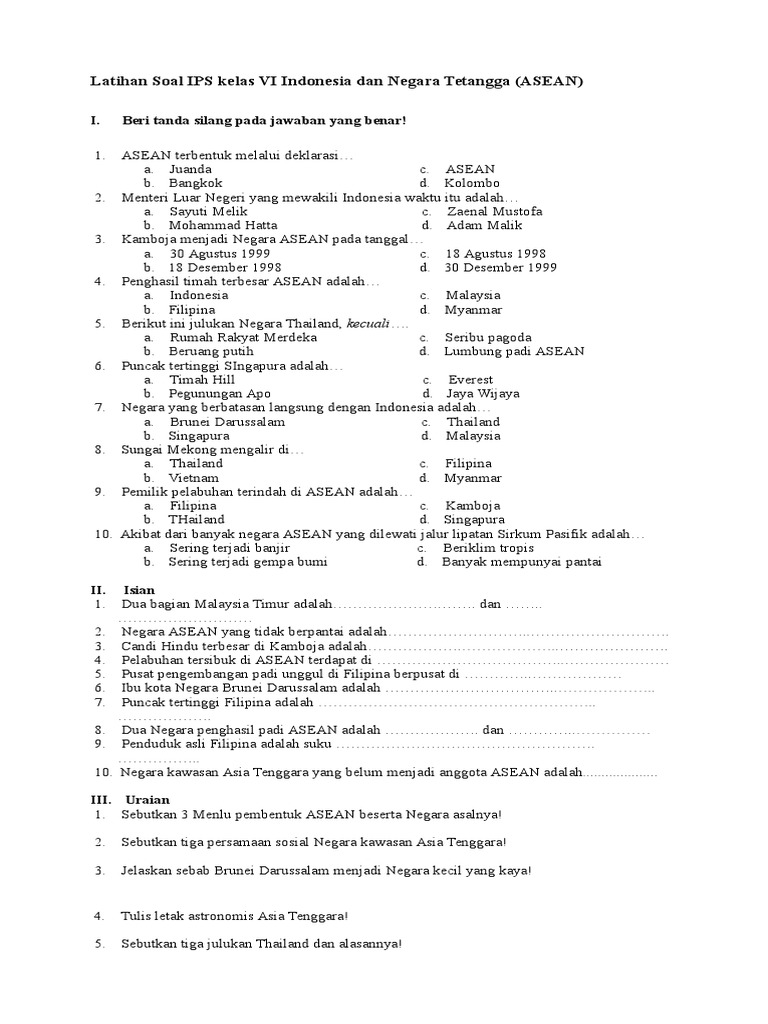 Latihan Soal Ips Kelas Vi Indonesia Dan Negara Tetangga Asean