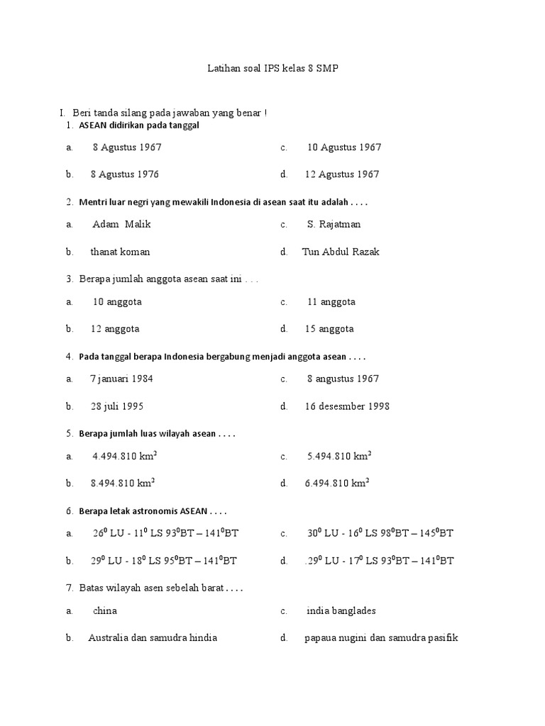 Soal yang disajikan berbentuk pilihan ganda berjumlah 25 Soal. Soal Soal Tentang Asean Dan Jawabannya. Sekretariat ASEAN berada di kota.