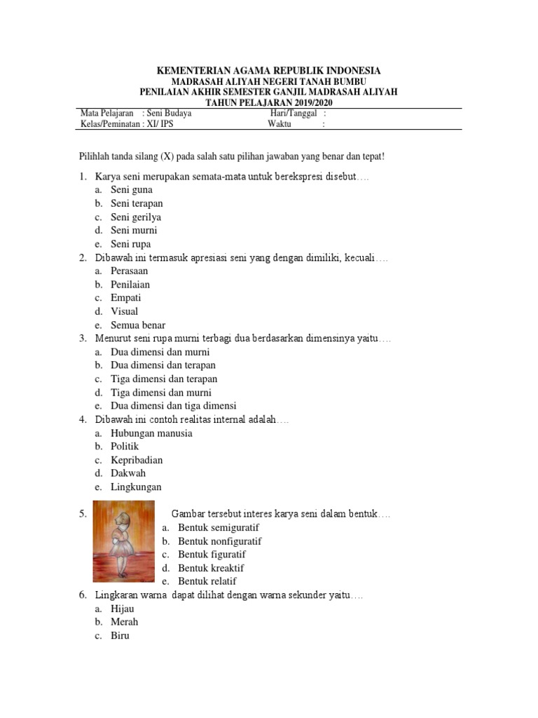 07092019 Soal Seni Budaya Kelas 11 Semester 1 beserta Jawabannya Contoh Soal Seni Budaya SenBud Kelas XI smt 1 K13 kurtilas Kurikulum 2013 revisi pilihan ganda atau disingkat PGPilgan untuk soal essay atau uraian di artikel selanjutnya. Buku ini merupakan buku siswa yang dipersiapkan Pemerintah dalam rangka implementasi Kurikulum 2013. 27012021 Seni rupa pengaruh islam di india yang berkembang mencapai puncak kejayaan pada masa demikian pembahasan materi kita kali ini mengenai soal seni budaya kelas 11.