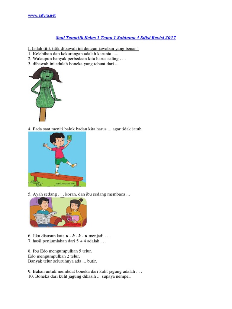 Soal Tematik Kelas 1 Tema 1 Subtema 4 Edisi Revisi 2017 Pdf