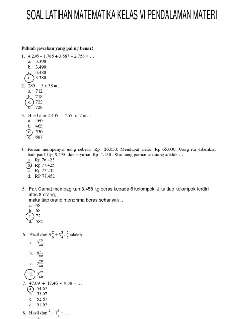 Soal Latihan Matematika Kelas Vi Pendalaman Materi Pdf